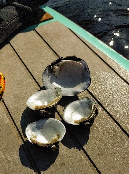 OK, so it wasn’t deep sea diving, it was more like holding my breath for a few seconds while I un-snag this lure. While in the water though, I briefly opened my eyes to see where I was (probably not recommended in such waters). Something else sparkled. I came up with my new lure and then back down I went. I just grabbed for the shiny objects as if it couldn’t possibly be anything that could harm me.