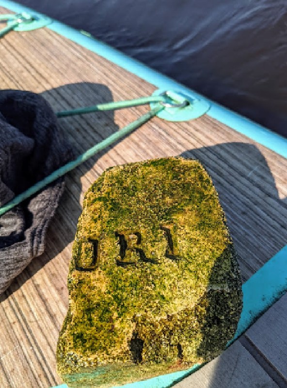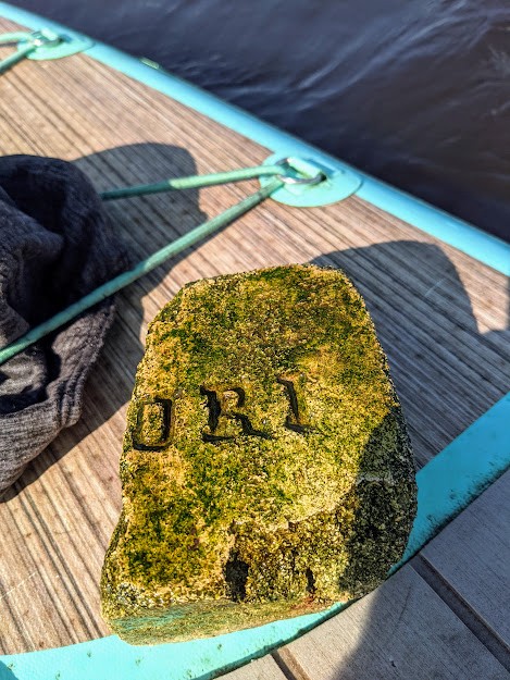 I came up with some shells and then saw something else jutting out from the sand now swirling around. OK, curiosity got me once, it got me again. Back in I went and pulled. Out of the water I emerged, with an engraved stone. Concrete. All that showed on the corner stone was “ORI.” Ori? What the heck does that mean? What is this? Is it a sign? Is it a gravestone? What was it doing in the Mississippi river in La Crosse, WI?